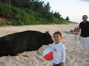 そこへ黒くて大きな闘牛がさんぽに来た。なんてゆったり。牛もさんぽ、母もさんぽ。背中のベビに子守唄「島唄」を選曲、 わが愛しい3人と夕日のコントラストに完全に酔う私。