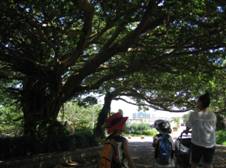 ぬぬっ巨大な木。これががじゅまるか。がじゅまるでかい。沖縄の木はひらべったく葉が茂っていてわざと木陰を作ってくれているみたいだよ。 名前がわからない花もいろいろ咲いている。こんなに暑いのに。 暑いところには暑くても元気な植物がたくさんおられるのですね。