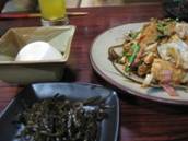 どれどれゴハンは。寿司やカレーもありこどもらは喜ぶ。ソーキそば、名も知らぬチャンプルー風のもの数点、サーターアンダギー、ぜんざい。 沖縄の庶民食に触れられた気がして嬉しい。