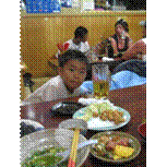 食事終わりましたか混んでますね子ども3人もいて一人はまだ赤ん坊なんですでもええごゆっくり待ちますあちょっと子どもが的光線を放ち苦笑いのサラリーマン風男性2名のご厚意により早め座席ゲット、 家族を座らせて早めのランチ。オキナワも何もない、 ただの食糧。目前には活きのいい魚たち…。うまそうと思うのは私だけではないはず。