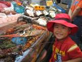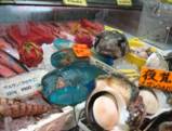 とりあえず記念撮影。いろとりどりの魚やでっかいエビに巨大貝。さすが観光名所、それぞれわかりやすく名札が付いている。でも買って帰って調理するような腕もやる気もないからのぞいてまわるだけよ。