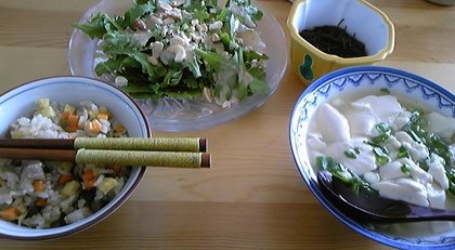 さて、2日目。 朝ご飯を作ってみました。とはいっても、買ってきた野菜でサラダ、 モズク酢。ジューシーといって炊き込みご飯。そして、ゆし豆腐。 飲んだ朝に、ゆし豆腐は最高だね。やさしい味がいい感じ。 いただきまーす。うん、うまし! 朝ご飯を外食しないでいいってのは、ちと嬉しい。節約にもなるしね。 正直、朝からやってる店って吉野家かマックくらいしかなさそうだし。