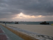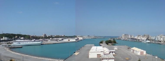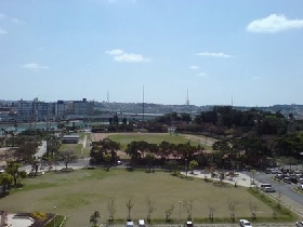 こっちは、寝室のベランダから。角部屋なので、ベランダが2つあります。 おお、ナイスなパノラマ! アメリカの軍港ですが、なんか豪華客船みたいなのが停泊してます。 東シナ海が遠くに見えますね。しかし米軍は広い土地持ってるんですねー。 返せっていいたくなる気持ちもわかるよ。