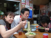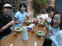 お昼は、コンドミニアム近くの亀かめそばに行ってみた。 中庭でそばを食うメンバー。今回の旅のテーマの一つに 沖縄そばを食いまくる、ってのがあるので。