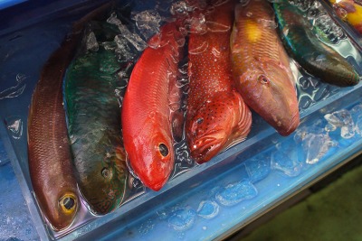 その後は「第一牧志公設市場」へ。ここはダンナさんが大好きな場所。色とりどりの魚貝や豊富なお肉の種類にノアもびっくり。沖縄の食材、あぐー・島ラッキョウ・そして泡盛を購入。お部屋に帰りキッチンでアグーを炒め、泡盛で乾杯!あーーー沖縄を堪能しています。おいしいです!!