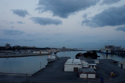 夜明け。寝室から撮影。軍港のようです。視界が開けて気持ちいいです。