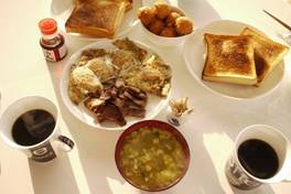 沖縄最終日の三日目はダンナさんの友人をたずねてあちこち回る日となりました。出発前に風が心地よいリビングで朝食をいただきました。