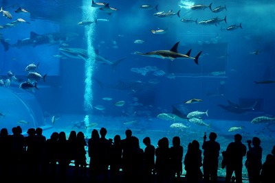 さて二日目は沖縄本島北部へ。透明度抜群の瀬底島で少し遊んでから、「ちゅら海水族館」へ行きました。とにかくスケールの大きな水族館です。 巨大な水槽は平面ではなく立体的でたくさんの魚たちが悠々と泳いでいる姿をいろんな角度から見られるようになっています。まさに海底を散歩しているような気分になれます。