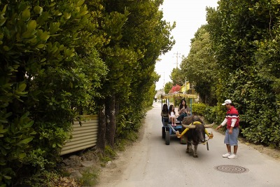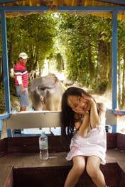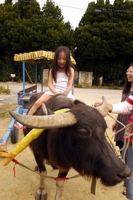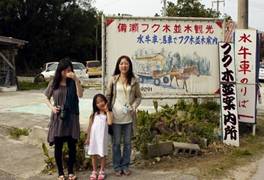 そして次は備瀬のフク木並木道を牛車に乗せてもらって歩く。水牛を間近に見て6歳の孫は大はしゃぎ。案内人さんのサービスで直接牛の背中に乗せてもらいました。